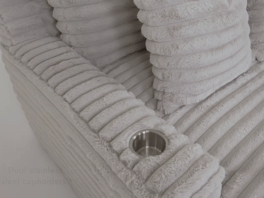 The Grand dove chaise lounge is the perfect addition to your living room for ultimate relaxation. Its ultra-dense, soft luxurious feel is made with wide, super soft corduroy fabric that is both durable and stylish. The chaise lounge has a lofty appearance and is accompanied by three back pillows and two down filled toss pillows for added comfort. With two USB ports, you can conveniently charge your electronic devices while lounging. And with two cupholders, you can easily enjoy your favorite beverage without having to get up. Whether you are watching a movie or reading a book, the Grand Dove Chaise Lounge is the perfect spot to unwind and relax.